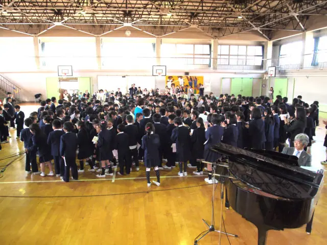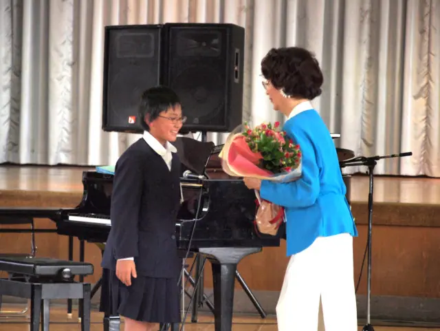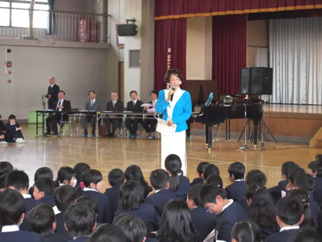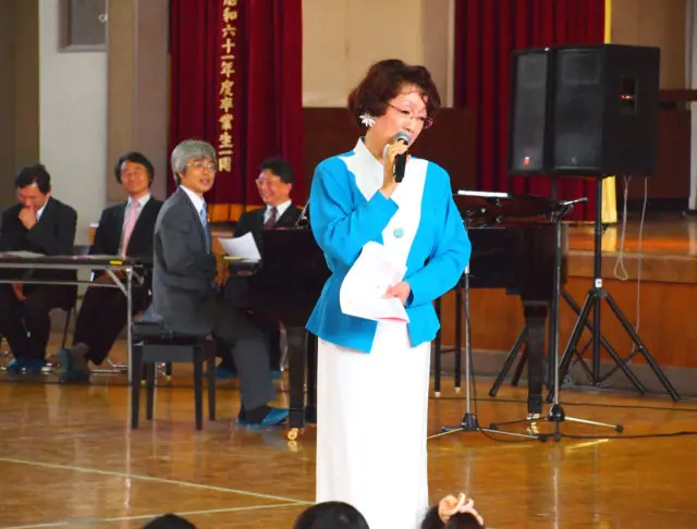 同校の児童約360人が参加した。同振興会の蘭一二三会長が「皆さんはつらい思いを乗り越えてきた。これからも頑張ってほしい」とあいさつした。贈呈式の後、加茂さくら氏は子供達に喜んで頂く為に「すみれの花の咲く頃」「花は咲く」「勇気100%」等を歌った。