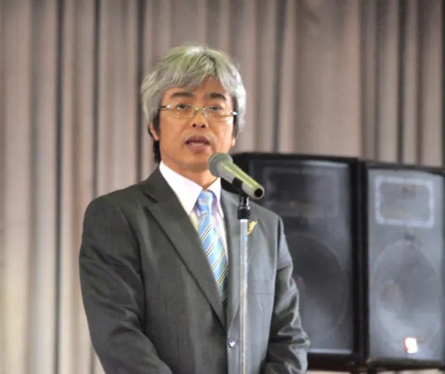 寄贈式で挨拶する蘭一二三